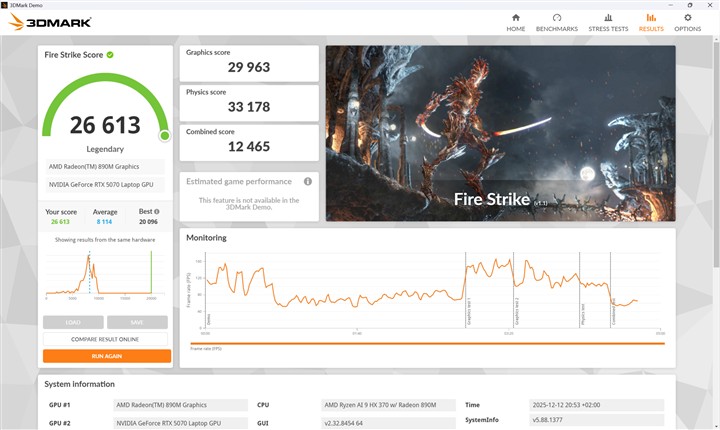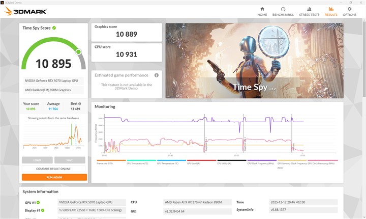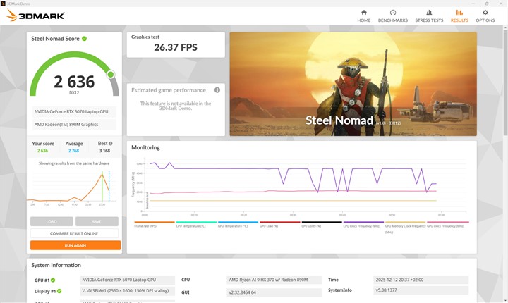 Cu procesor AMD Ryzen AI 9 HX 370 deosebit de eficient, care chiar impresionează pe această direcție (raport performanță / consum), cu nuclee deciate proceselor AI și cu un GPU integrat foarte capabil, care în anumite sarcini 3D face față fără probleme fără a fi nevoie de placa grafică dedicată. Iar atunci când este nevoie de aceasta, NVIDIA GeForce RTX 5070 Laptop cu 8 GB memorie GDDR7 demonstrează și ea câtă putere de procesare poate pune pe masă cu un consum rezonabil. Ca putere brută a GPU-ului, NVIDIA GeForce RTX 5070 Laptop nu este cu mult în fața predecesorului, anume RTX 4070, dar prin suita software pe care o poate susține, noua placă demonstrează că este pregătită pentru fel de fel de aplicații complexe, majoritatea celor mai folosite fiind excelent optimizate, mai ales dacă aleșgi driverele NVIDIA Studio.