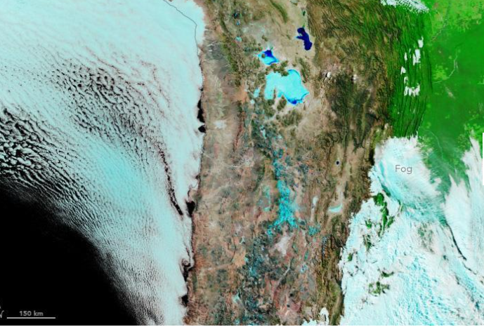 Astfel, o fotografie făcută din satelit în luna iulie indică Deşertul Atacama din Chile și zăpada rară care s-a aşternut aici. De asemenea, vremea geroasă a pus temporar observatorul Atacama Large Millimeter/submillimeter Array (ALMA) pe „modul de supraviețuire„. Imaginea din satelit impresionantă a surprins un spectacol istoric, care a avut loc acum şase luni, când unul dintre cele mai aride locuri de pe Pământ a fost afectat de o furtună de zăpadă rară.