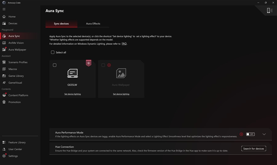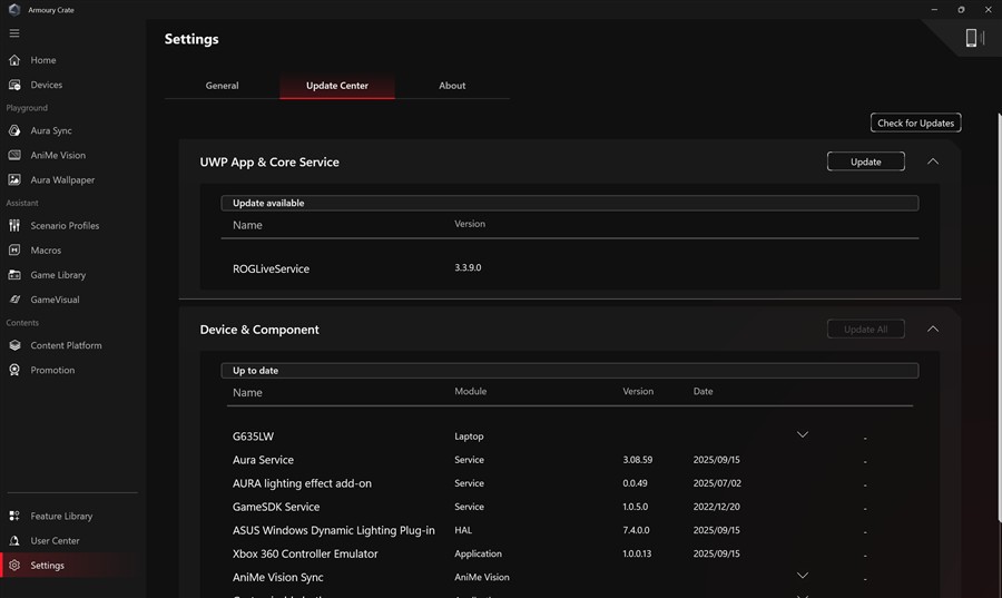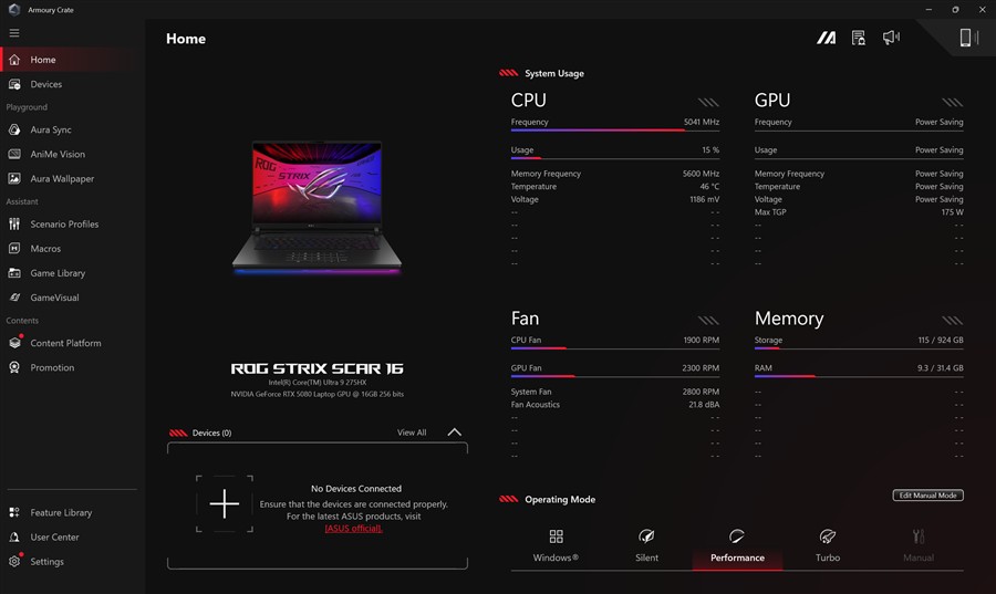 Aplicația Armoury Crate pe ASUS ROG Strix Scar 16 2025 (G635L):