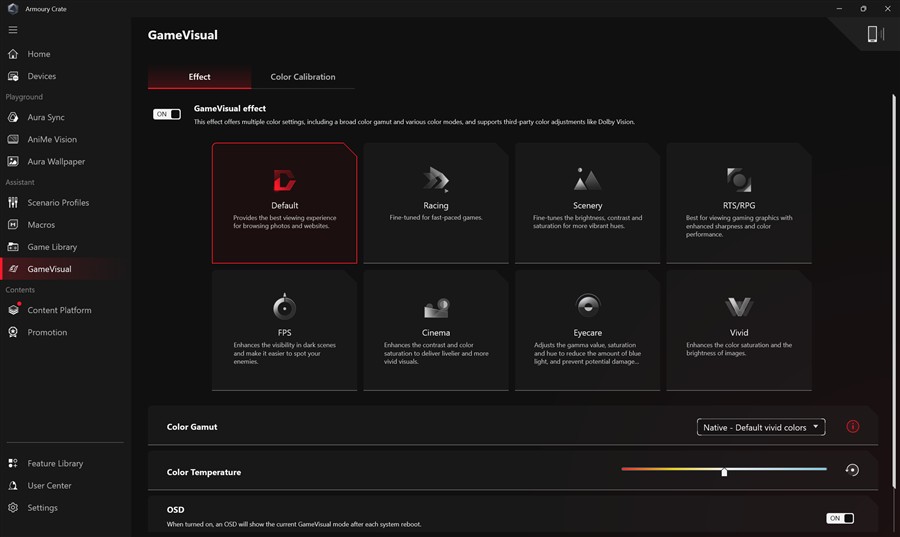 Culorile sunt foarte intense, dar pot fi reglate în detaliu, fix așa cum îți dorești din aplicația Armoury Crate, unde sunt mai multe profiluri predefinite, dar în care poți interveni pe mai multe linii spre a obține întocmai nuanțele, balansul de alb, contrastul și chiar conturarea dorită.