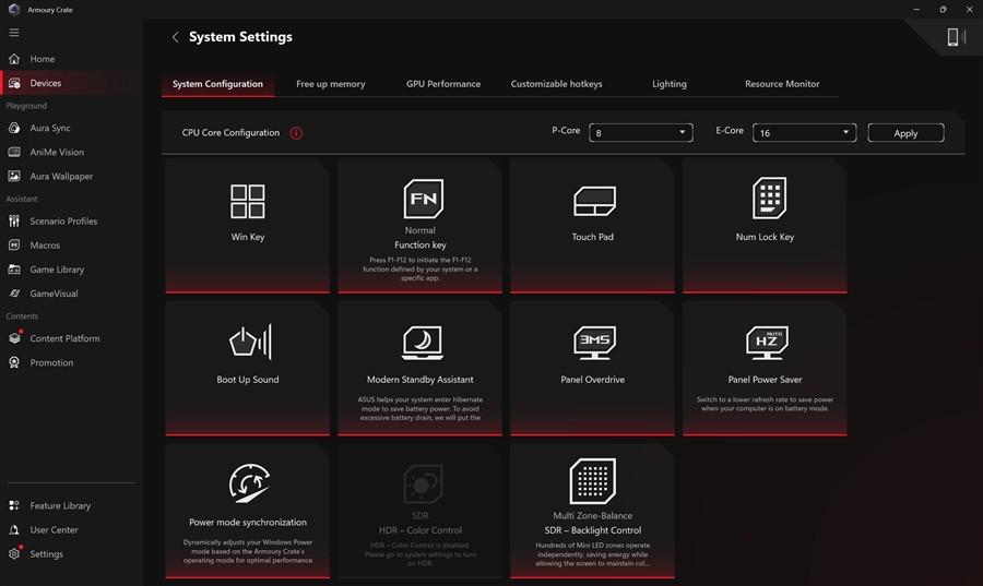 Sincer, nu am înțeles de ce este nevoie atât de Armoury Crate cât și de MyASUS, cumva aceste aplicații sunt complementare. Eu am ales să fac mai toate setările din Armoury Crate, mi se pare aplicația mai completă, așa că din aceasta vă pun la dispoziție capturi de ecran.