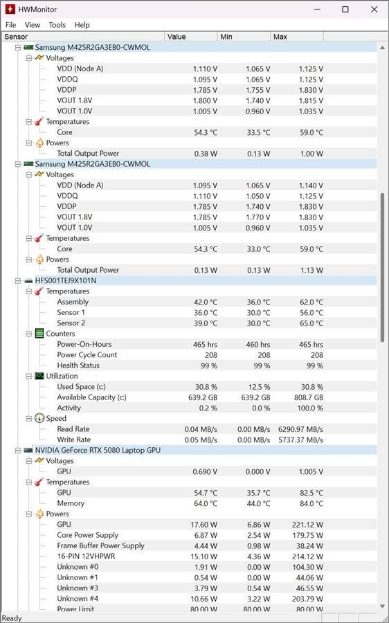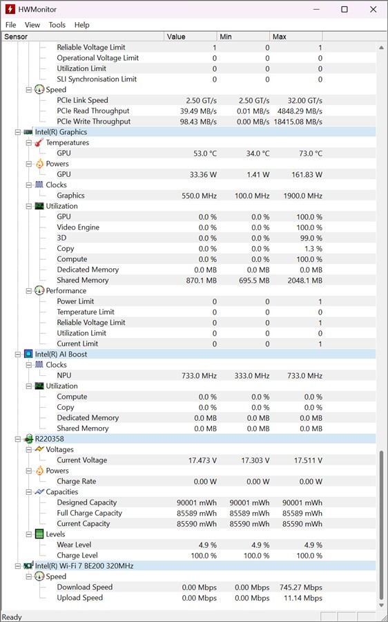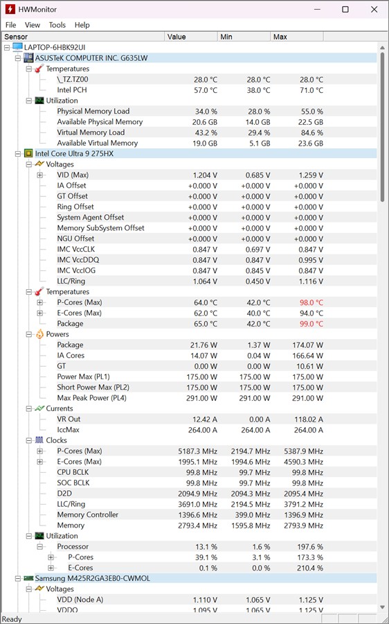 Informații preluate cu HWMonitor după testele de benchmark rulate pe ASUS ROG Strix Scar 16 2025 (G635L):
