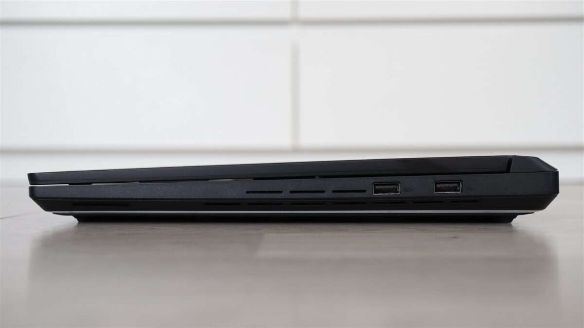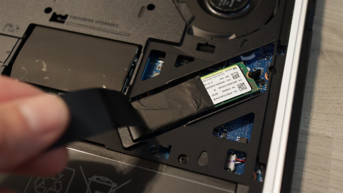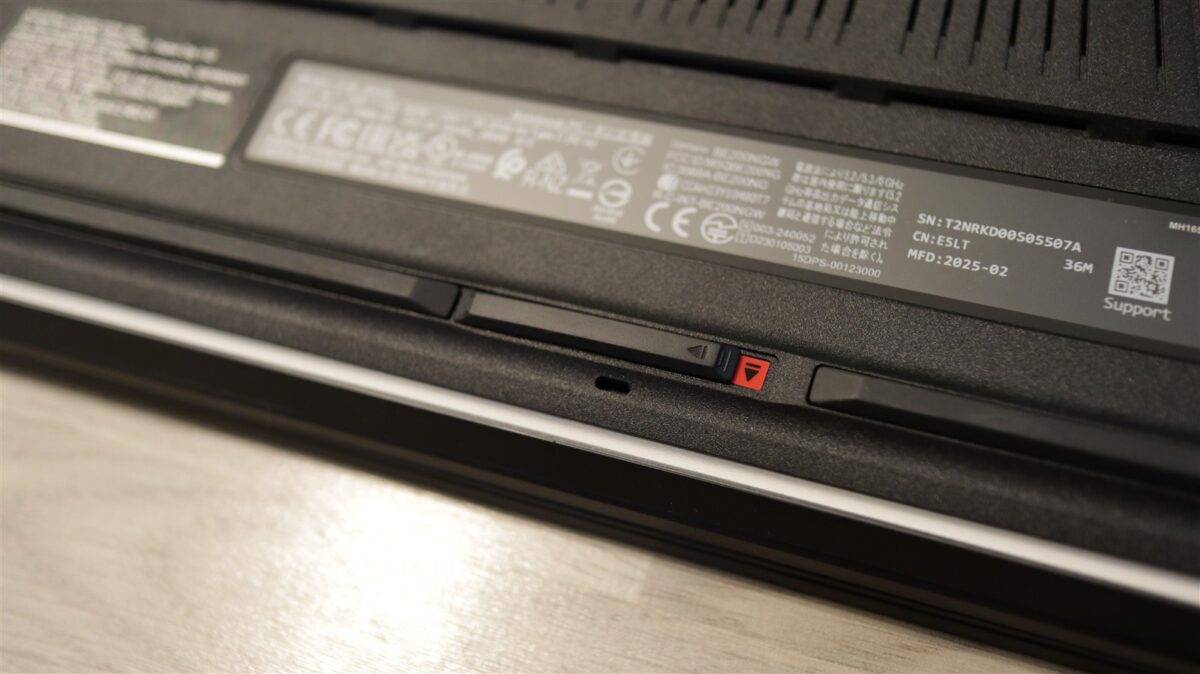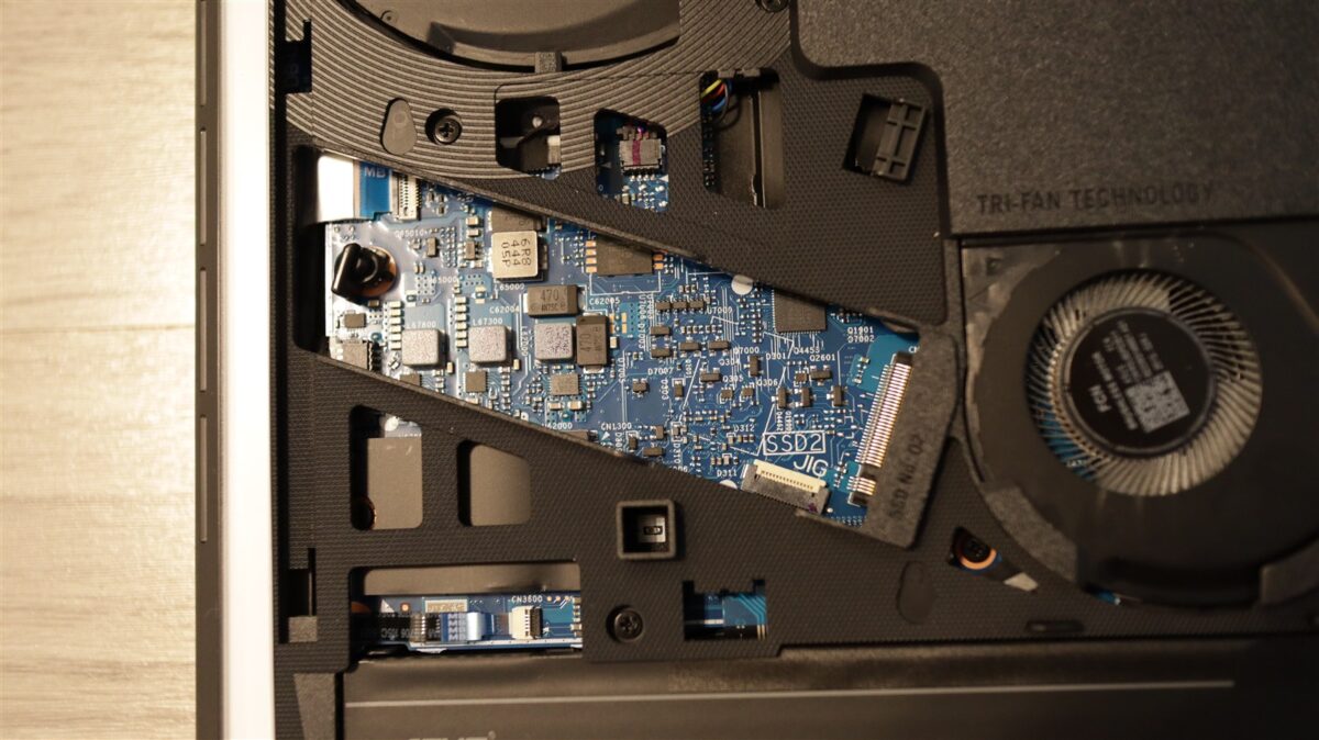 Inclusiv partea de jos a laptopului a primit o atenție deosebită, și nu mă refer aici doar la design, ci mai ales la cât de rapid poți desface capacul de plastic. Doar muți către către stânga un buton de deblocare, iar apoi glisezi în jos capacul și gata, ai acces la interior. Iar acolo, SSD-ul poate fi schimbat sau adăugat unul suplimentar în cel de-a doilea slot fără să ai nevoie de vreo unealtă (șurubelniță).