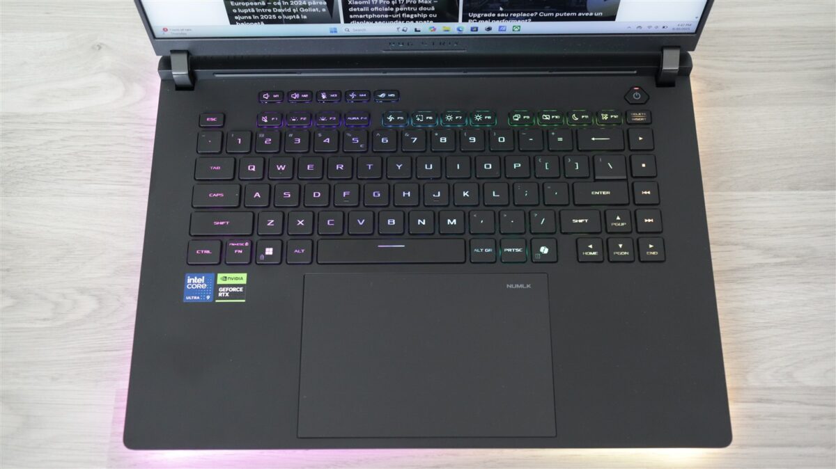 Pe de altă parte, totul arată bine și lasă senzația de calitate, chiar dacă plasticul de pe partea posterioară nu este cel mai pretențios, iar pe celelalte zone (capacul metalic al ecranului și zona din plastic mat din jurul tastaturii) prind imediat urmele mâinilor. Pe de altă parte, ASUS ROG Strix Scar 16 2025 (G635L) este extrem de solid, de robust, pare că poate rezista chiar și în scenarii mai dificile de exploatare, air aici mă refer la unele șocuri ce pot apărea pe timpul transportului.