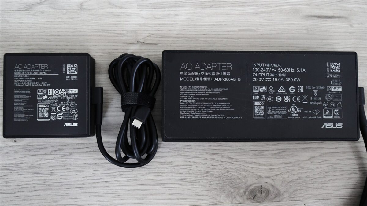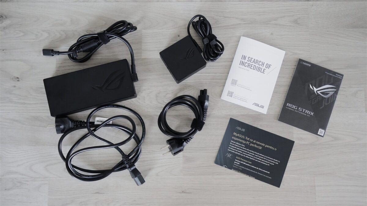 La mine unitatea de test a ajuns în cutia de retail, în care, aparte de laptop, am mai găsit două încărcătoare – unul masiv pe port proprietar, celălalt mai compact, pe port USB-C, și câteva pliante, cu informații diverse.