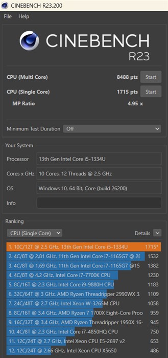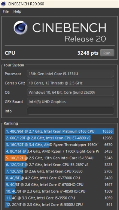 Ansamblul hardware, în cazul de față, are în centru un procesor Intel Core i5-1334U, cu 10 nuclee (2 x Performance-cores la maxim 4.6 GHz + 8 x Efficient-cores la maxim 3.4 GHz),12 fire de execuție și cu grafică integrată de tip Intel Iris Xe. Este un procesor potrivit pentru sarcinile office și poate chiar și ceva mai complicat de atât, dar nu este un CPU pe care să te poți baza în aplicații complexe. Am rulat și ceva teste de benchmark, pe care le voi pune mai jos, sub formă de capturi de ecran, spre a ne putea edifica mai bine pe partea de performanță.
