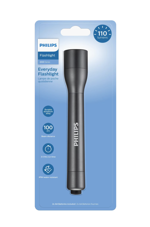 Funcționează cu 2 baterii AA, 110 lm și proiectează lumină până la 100 metri distanță (așa afirmă Philips). Este construită din aluminiu.