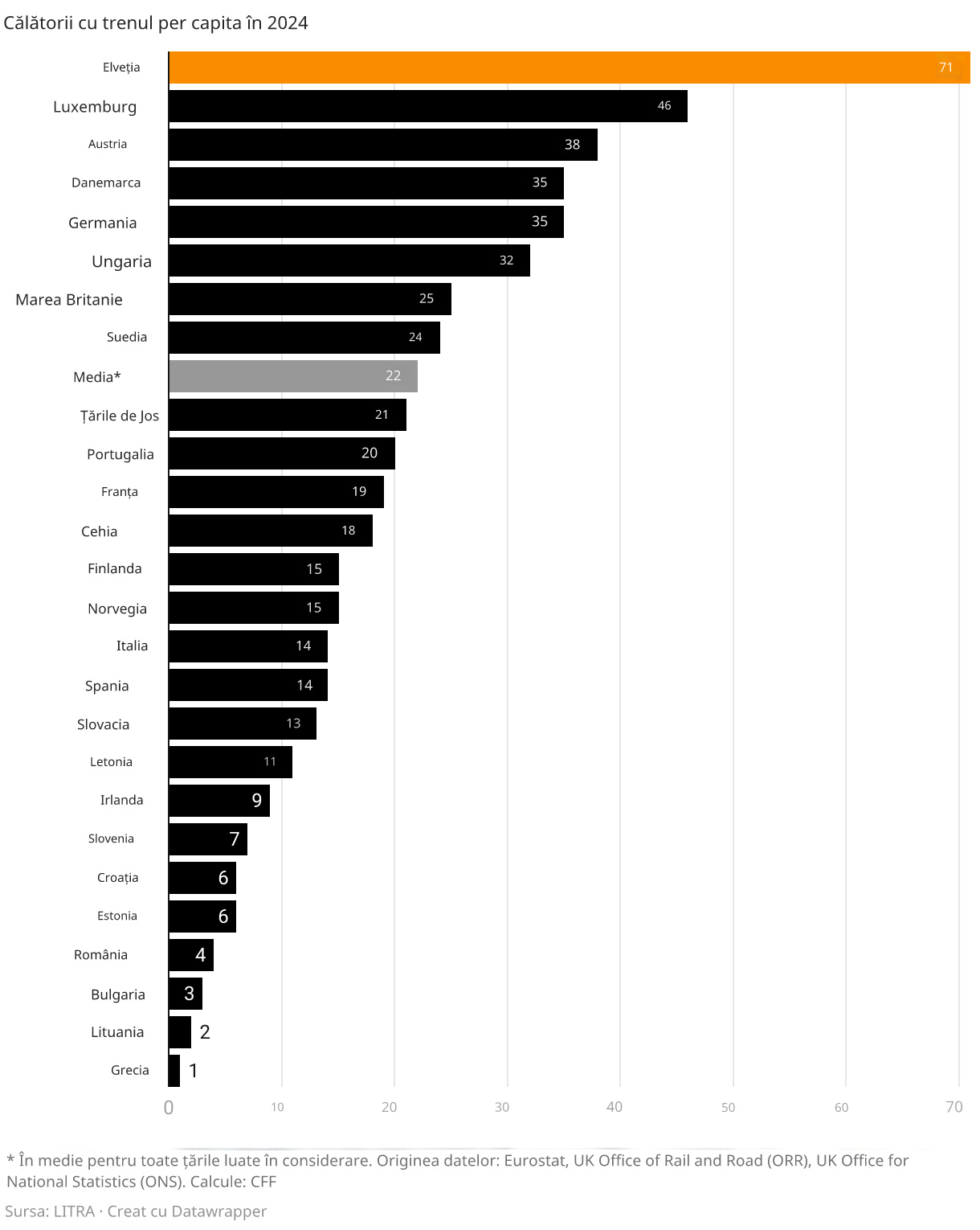 Totodată, elvețienii au efectuat anul trecut 71 de călătorii feroviare per locuitor, de aproape patru ori mai mult decât media europeană și de peste 17 ori mai mult decât în România.