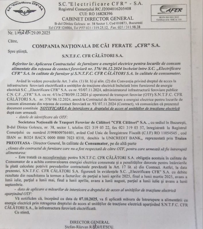”(…) vă comunicăm că prezentul document constituie NOTIFICAREA de interzicere a dreptului de acees al unităților de tracțiune electrică după cum urmează: – datele de identificare ale OTF: Societatea Națională de Transport Feroviar de Călători CFR Călători S.A. (…) reprezentată prin Traian Preoteasa – Director General, în calitate de Consumator, pe de altă parte clauza din contractul de furnizare care nu a fost respectată de către OTF, pentru care urmează să fie întreruptă alimentarea: Este tratată ca neconformitate pentru S.N.T.F.C. CFR Călători S.A. obligația acestuia în calitate de Consumator de a achita contravaloarea energiei electrice consumate şi a penalităţilor datorate pentru întârzierile la plată calculate potrivit prevederilor contractuale prevăzută la Art. 17 lit. a) din Contract. Astfel, la data prezentei, S.N.T.F.C. CFR Călători S.A. figurează în evidenţele S.C. Electrificare CFR S.A. cu debite rezultate din neachitarea la termen a facturilor: de parţial a lunii aprilie 2025, final al lunii martie 2025, avans al lunii iulie, parţial a lunii mai, final a lunii aprilie, avans a lunii august, parţial a lunii iulie şi avans a lunii septembrie. Data de aplicare a măsurilor de interzicere a dreptului de acces al unităţilor de tracţiune electrică aparţinând OTF: Vă notificăm că, începând cu data de 07.10.2025, va fi aplicată măsura de întrerupere a alimentării cu energie electrică prin retragerea dreptului de acces al unităţilor de tracţiune electrică aparţinând S.N.T.F.C. CFR Călători S.A., la infrastructura feroviară electrificată”, se arată în documentul semnat de directorul general al Electgrificare CFR SA, Ștefan-Răzvan Rădulescu.