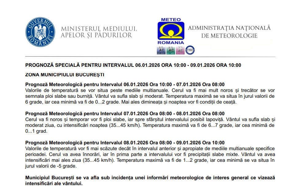 „Temporar vor fi precipitații în cea mai mare parte a țării și se vor acumula cantități de apă de 10…40 l/mp. Acestea vor fi mixte și va fi polei, în cursul zilei de 6 ianuarie în Banat, Crișana, Maramureș, nordul și vestul Transilvaniei, apoi treptat vor predomina ninsorile și se va depune strat de zăpadă consistent de 15…30 cm.