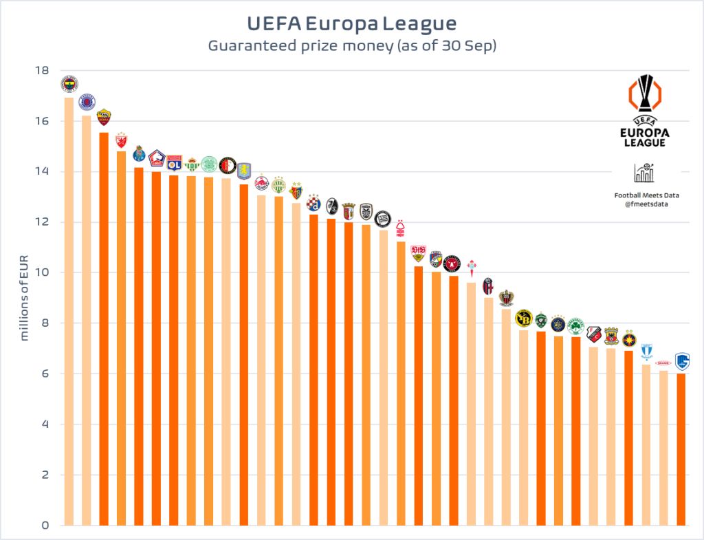 Adversarele ocupă în clasamentul veniturilor din Europa pozițiile 32 (Go Ahead Eagles), 27 (Young Boys Berna), 25 (Bologna), 15 (Dinamo Zagreb), 14 (FC Basel), 10 (Feyenoord), 4 (Steaua Roșie Belgrad), 1 (Fenerbahce). Sumele obținute de adversarele FCSB variază între 8 și 17 milioane de euro.