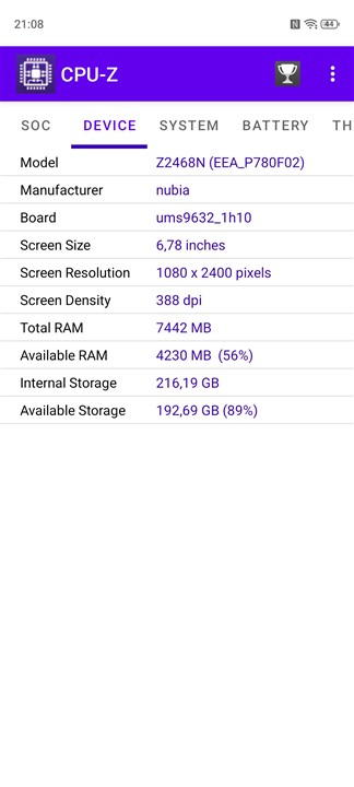 Capturi de ecran din aplicația CPU-Z cu informații despre ZTE nubia Air:
