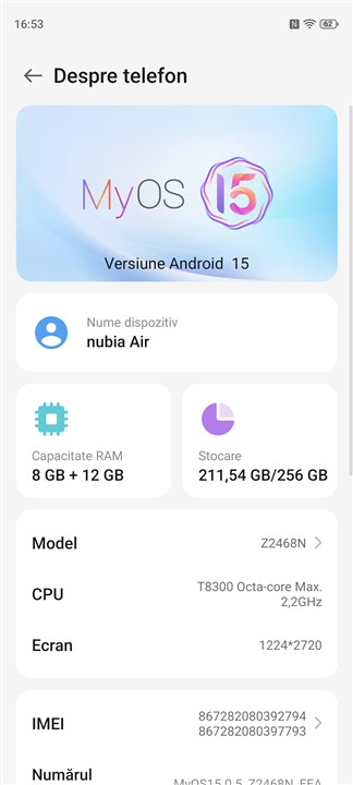 La nivel de sistem de operare, ZTE nubia Air rulează Android 15 peste care este aplicată interfața MyOS 15. Aceasta, chiar dacă adaugă fel de fel de opțiuni pentru o personalizare mai accentuată, precum și setări adiționale, nu modifică substanțial ceea ce știm de la sistemul nativ de operarea al celor de la Google.