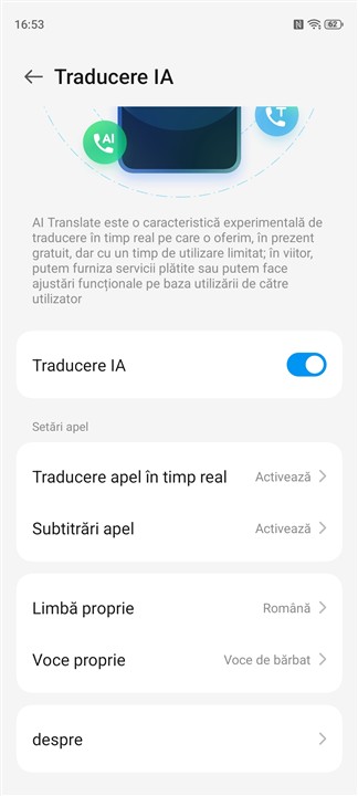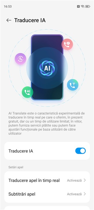 Apar, așa cum este deja tradițional la orice producător, funcții AI. Aici sunt cele precum traducere automată face-to-face și chiar în timpul apelurilor, unde am găsit disponibilă inclusiv limba română. Totodată, poți activa funcția de subtitrare text pentru convorbirile telefonice. Ca și în alte cazuri, aceste funcții sunt folositoare, fără discuție, dar nu sunt mereu cel mai bine implementate și nu funcționează fără reproș, nici pe departe… Dar, repet, acesta nu este cazul doar pentru ZTE nubia Air, ci pentru mai toate implementările cu care am luat eu contact.