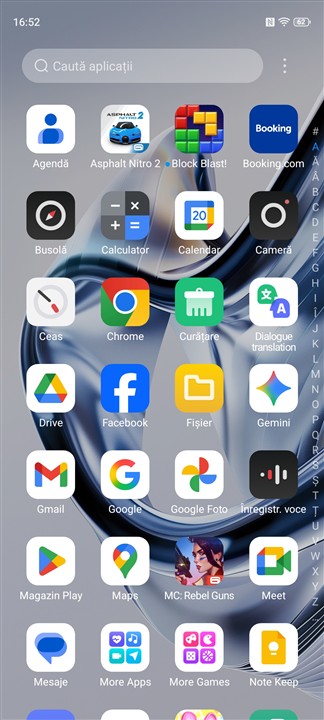 Ca aplicații preinstalate, din nou surpriză. Mă așteptam să fie mai multe puse de-a gata de către ZTE, dar, dacă nu le bifezi în timpul procesului de configurare inițială, nu vei descoperi ulterior decât Asphalt Nitro 2, Block Blast, Booking.com, Curățare, Dialogue translation, Facebook, MC: Rebel Guns, More Apps, More Games, nubia linkfree, Puzzle pets, Schimbare telefon, TikTok, WPS Office și ZTE Cares. Pot părea multe, dar de fapt sertarul cu toate aplicațiile este suficient de aerisit, să spunem.