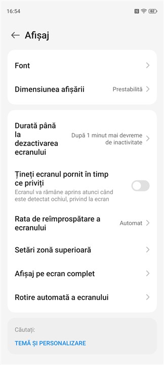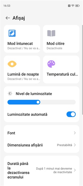 Meniul cu setări ale afișajului de pe ZTE nubia Air:
