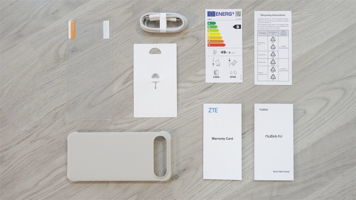 Eu am primit pentru test telefonul în culoarea Titanium Desert (mai există opțiunea pentru Titanium Black), care a ajuns în cutia de retail sigilată. Înăuntrul acesteia mai avem o husă de tip bumper, o folie din plastic pentru protecția ecranului, un cablu cu mufe USB-C la ambele capete, o agrafă pentru acces la slotul SIM, ghid de pornire rapidă, certificat de garanție și alte pliante cu informații diverse.