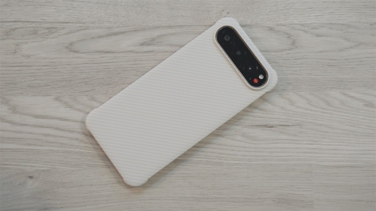 Culoarea Titanium Desert imprimă multă eleganță acestui smartphone, nuanța fiind una caldă. Husa de protectie din pachet este de fapt un bumper care acoperă spatele în întregime, dar care pe laterale se oprește strict la a îmbrăca colțurile. Pare că designerii nu au vrut să acopere tocmai șasiul din aliaj de aluminiu, cu adevărat o raritate în acest segment de preț. Revenind la husă, aceasta are un model ca de fibră de carbon și o textură mată, ușor cauciucată, care generează o aderență foarte bună în palmă.