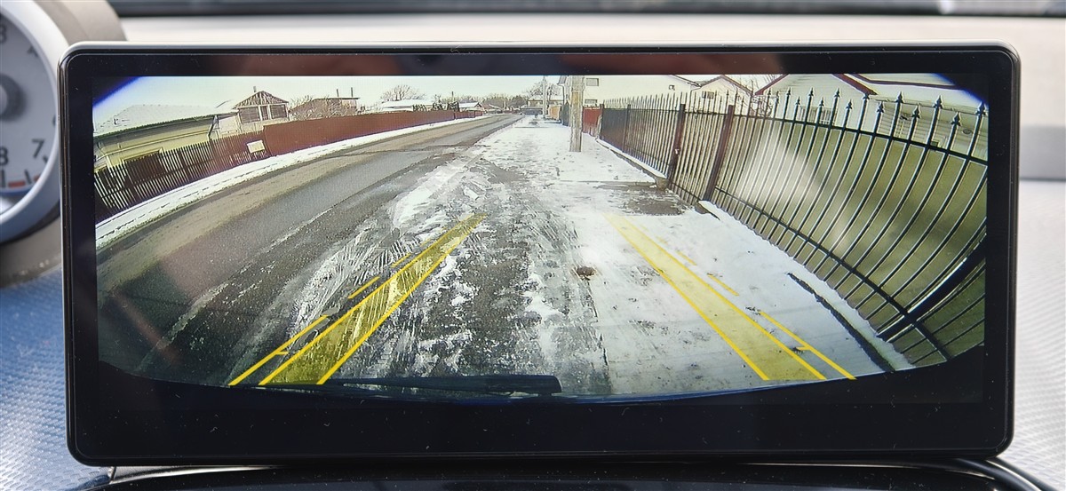 Eu mai pot adăuga aici și câte informații despre camera de mers înapoi, pe care am primit-o la pachet cu CarpodGo T3 Pro. Este o cameră cu rezoluție Full HD 1080p, una pe care o poți monta atât în interiorul vehiculului, cât și în exteriorul acestuia. Este am ales prima varianta, ceva mai comod de realizat în cazul meu. Este nevoie ca un cablu să fie conectat la CarpodGo T3 Pro, cel lung cu mufă mini jack AV la capăt, iar un alt cablu, care se desparte de cel principal aproape de ieșirea din cameră, să fie conectat la polul pozitiv (+) al becului de marșarier al mașinii. Astfel, de fiecare dată când pui levierul cutiei de viteze în R, becul de iluminare din spatele mașinii se aprinde și astfel primește comanda de pornire și camera video de marșarier. Aceasta oferă o imagine neașteptat de clară, cu o expunere corectă de fiecare dată și are și două linii virtuale de ghidaj, care însă nu corespund neapărat cu realitatea, cel puțin nu în cazul meu, la cum am montat eu această cameră.
