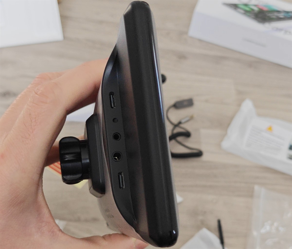 Pe spate, vedem prinderea cu bilă, care însă nu este fixată pe dispozitiv. Este vorba despre o prindere magnetică, așadar poți detașa foarte rapid dispozitivul în anumite situații. Este drept că asta înseamnă să deconectezi și cablurile adiacente, dar dacă este nevoie să iei de pe bord CarpodGo T3 Pro atunci consider că prinderea magnetică ajută.