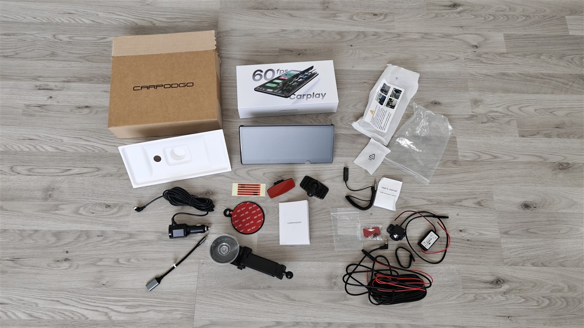 La mine CarpodGo T3 Plus a ajuns într-o cutie ceva mai mare, iar asta fiindcă pe lângă produsul propriu-zis am mai primit și o cameră video pentru marșarier, un suport suplimentar. Primele două sunt accesorii opționale, al treilea va ajunge ca și bonus la toți clienții. În cutia produsului CarpodGo T3 Pro găsim, pe lângă dispozitivul în sine, și două prinderi de bord dublu adezive, adaptorul de alimentare, patru benzi subțiri dublu adezive, cablu de tip OTG de la mufă USB-C la port USB-A și un mic ghid de pornire rapidă.