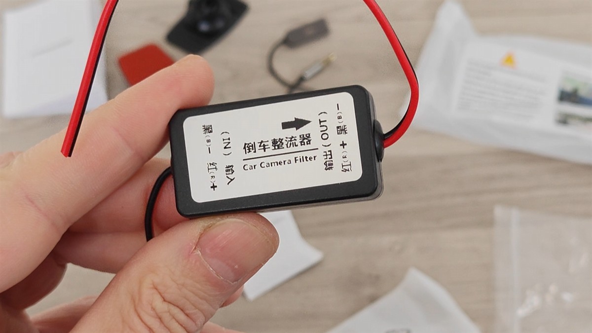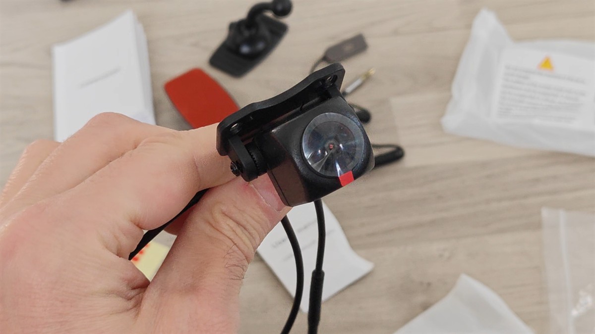Camera video de marșarier vine alături de cablu lung pentru conexiunea la dispozitivul CarpodGo T3 Pro, de un adaptor care flirtează (la nevoie) curentul de la becul de marșarier, de două șuruburi de prindere și de un sticker dublu adeziv, dacă nu vrei să folosești cele două șuruburi.