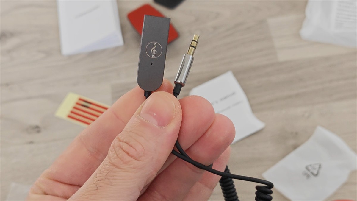 Opțional, aparte de camera de mers cu spatele, mai poți alege și un adaptor Bluetooth, pe care l-am primit și eu. Acesta dispune de un jack audio de 3.5 mm și un port USB-A, între care este un cablu extensibil.