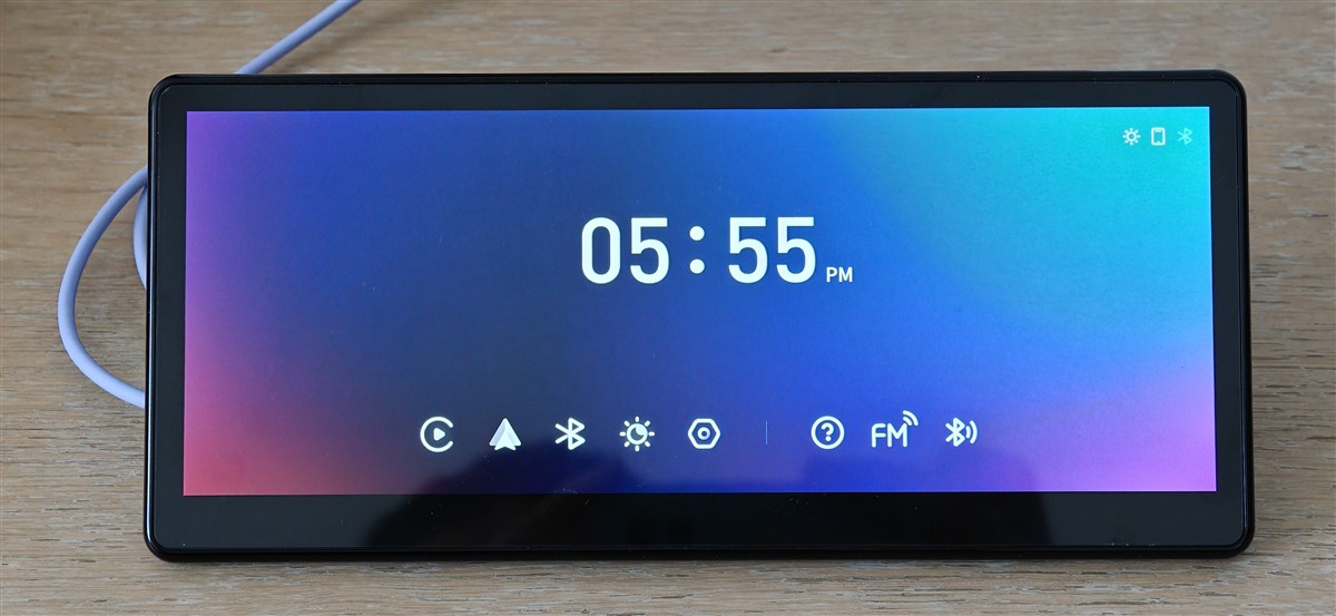 După ce ai parcurs cei doi pași (fixarea dispozitivul și alimentarea lui) poți deja să parcurgi rapid interfața CarpodGo T3 Pro. Mă refer la cea care apare înainte de a avea conectat telefonul. Interfața este simplă, cu un ecran Home pe care apare în centru un ceas digital, iar mai jos câteva iconițe pentru acces rapid către Apple CarPlay sau Android Auto (când este realizată conexiunea), la meniul Bluetooth, la cel al reglajelor afișajului și la cel cu toate setările. Un meniu Help și butoanele prin care faci trecerea de la sursa audio (FM sau Bluetooth) completează lista cu butoane de acces rapid de la baza ecranului.