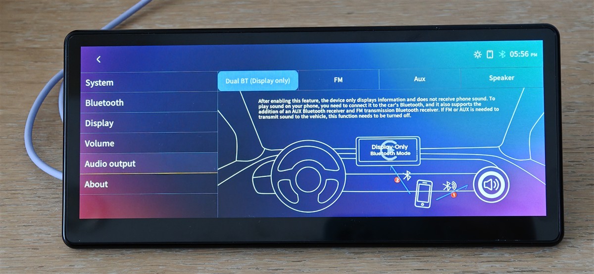 Există două moduri în care poți conecta telefonul la CarpodGo T3 Pro: primul în mod Display-Only Bluetooth, când telefonul trimite către CarpodGo T3 Pro strict semnalul video și poți conecta simultan telefonul la sistemul audio al mașinii, dacă aceasta dispune de conexiune Bluetooth; în al doilea scenariu conectezi clasic telefonul la CarpodGo T3 Pro, care primește atât semnal video, cât și audio. În acest al doilea caz, conținutul audio poate fi redat de către difuzorul CarpodGo T3 Pro, prin ieșirea Aux Output sau prin radio FM. Da, CarpodGo T3 Pro integrează și transmițător FM și poate trimite conținutul audio de pe telefon prin unde FM către radioul mașinii. Poți seta din interfața proprie CarpodGo T3 Pro frecvența de transmisie, cauți apoi acea frecvență pe radioul mașinii și… gata.