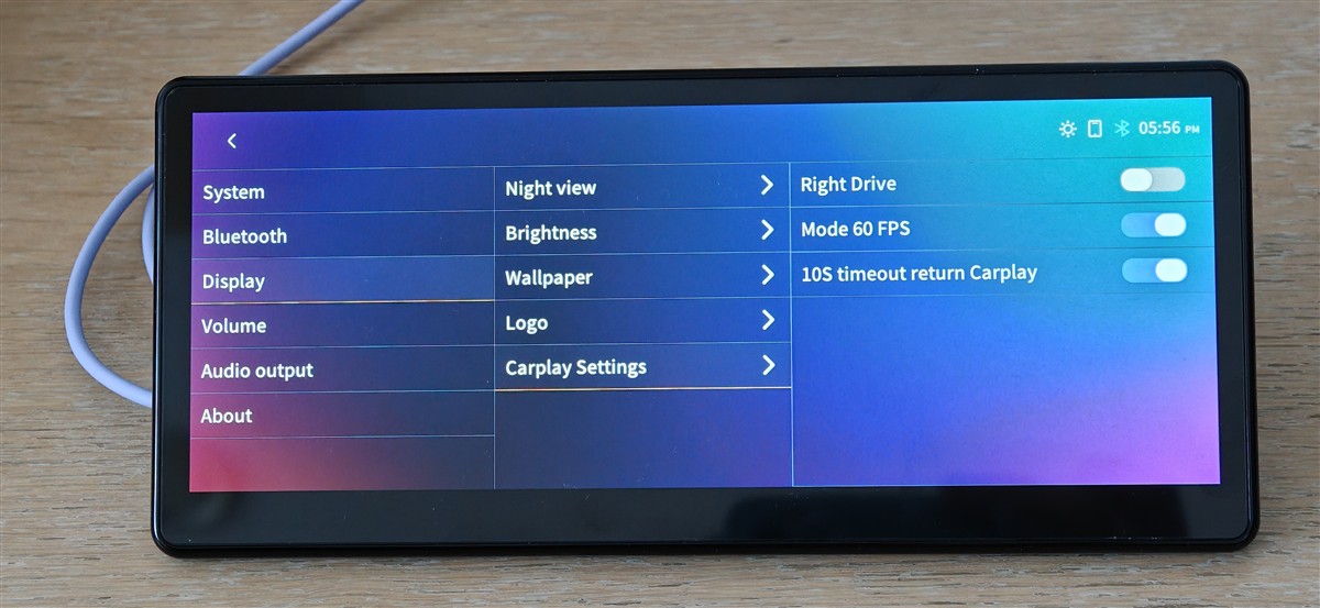 Așa cum vedem mai sus, meniul cu toate setările este simplu și logic structurat, fiind facil de parcurs și de înțeles. Am apreciat foarte tare că poți alege ce logo auto să fie afișat de sistem la inițializare, adică de fiecare dată când CarpodGo T3 Pro pornește. Sunt mai toate mărcile auto prezente, cu logo-ul fiecăreia. Totodată, mi-a mai plăcut că poți alege un fundal pentru interfață, cu toate că, pe de altă parte, nu sunt decât trei opțiuni acolo…