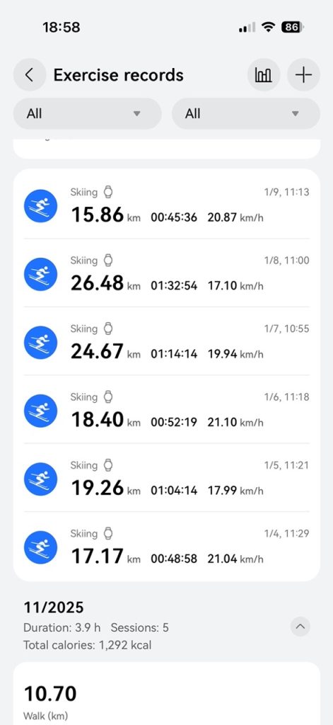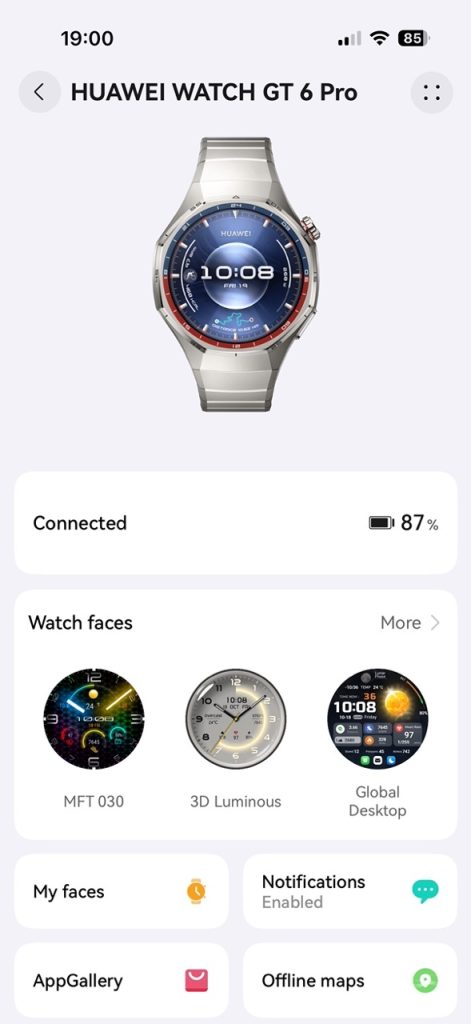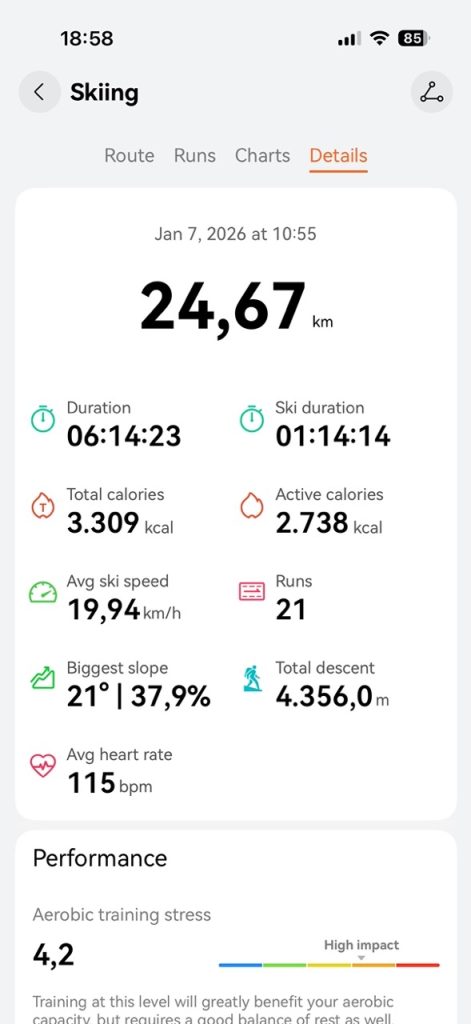 Am reușit să testez la schi ceasul smart Huawei Watch GT 6 Pro și pot să adaug câteva detalii importante peste ceea ce am spus în review-ul din vară. O să încep prin a vă spune că l-am folosit tot împreună cu iOS, folosind un iPhone 16 Pro, cu versiunile la zi de firmware pentru ceas (6.0.0.173) și sistem de operare pentru telefon (iOS 26.2).