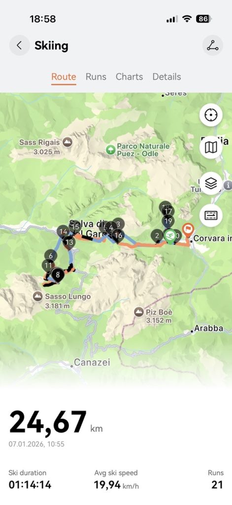 După cum reiese și din imagini, sunt oferite date suficiente despre deplasare, distanța parcursă, diferența de altitudine, pe ture – sunt însă mai degrabă momentele de deplasare fără oprire, decât o tură în sine. Pentru că dacă te oprești pe pârtie (să îți mai tragi sufletul, să îți ajustezi ochelarii sau mânușile etc.), la repornire e considerată o altă tură.