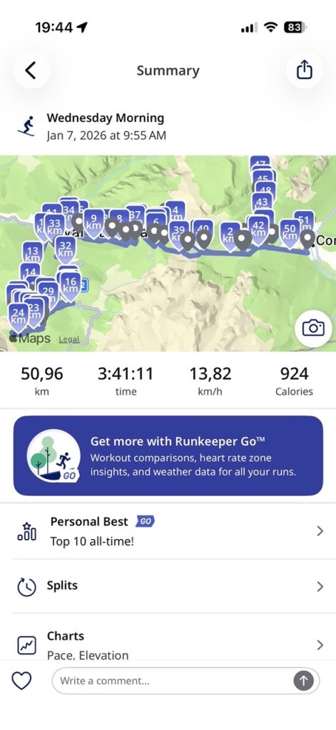 Runkeeper pune distanța totală parcursă, nu doar cea de pe schiuri, cu bucăți mai clare legate de viteză, însă calculează altfel viteza medie, cu toate că există și aici algoritm care detectează momentele în care te-ai oprit.