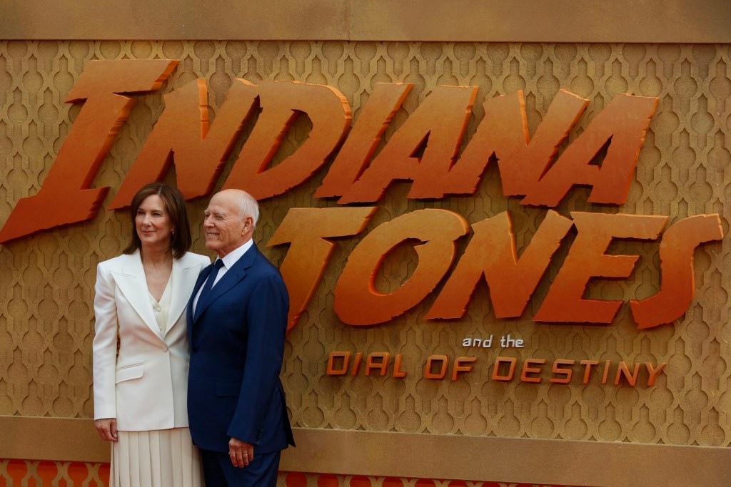 Kathleen Kennedy alături de soțul ei, producătorul Frank Marshall, la premiera ultimului film „Indiana Jones”, cealaltă mare franciză a Lucasfilm și Disney, FOTO: Backgrid / Backgrid UK / Profimedia Images