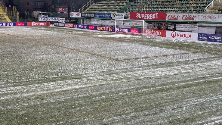 Miercuri seară, clubul alb-violet a prezentat starea gazonului „Orășenescului” din Mioveni. În imagine sunt vizibile doar câteva mici zone cu gheață, semne pozitive în vederea meciului.