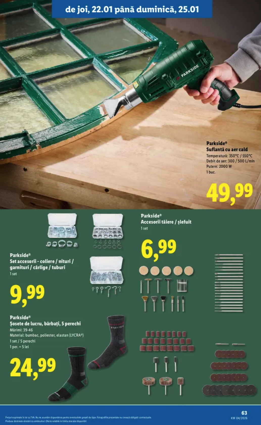 Suflanta cu aer cald are putere de 2000W, temperaturile atinse sunt de 350 grade / 550 grade Celsius, iar debitul de aer urcă la 300 / 500 litri pe minut. Mai sunt și accesorii – coliere, nituri, garnituri etc, dar și…, șosete de lucru Parkside.