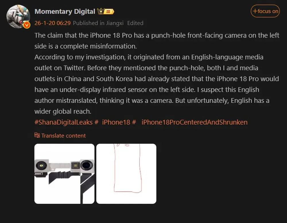 Leaker-ul „Instant Digital” de pe platforma Weibo, clarifică faptul că rapoartele anterioare care indicau o cameră frontală mutată în colț au fost, cel mai probabil, rezultatul unor erori de traducere. Sursele asiatice inițiale se refereau la relocarea unei componente interne specifice, nu la o modificare vizibilă a camerei frontale, detaliu care a fost interpretat greșit de presa occidentală ca fiind o schimbare majoră de design exterior.