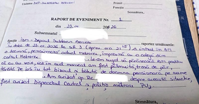 Club Feroviar a intrat și în posesia Raportului de eveniment (vezi foto) întocmit de impiegata în cauză: ”În data de 23.01.2025, la schimbul 3 (aprox. ora 21:15) a intrat în BM (Biroul de Mișcare – n.red.) o doamnă, pensionară actual Metrorex, împreună cu o colegă din cadrul Metrorex. Le-am rugat să părăsească BM pentru că nu au voie, iar în acel moment am fost pălmuită, trasă de păr, târâtă pe jos în tot biroul și bătută de doamna pensionară pe nume (…) Am avizat RC (…) despre acestă situație, a fost avizat Dispecerul Central și Poliția Metrou PU2 (Piața Unirii 2 – n.red.)”.