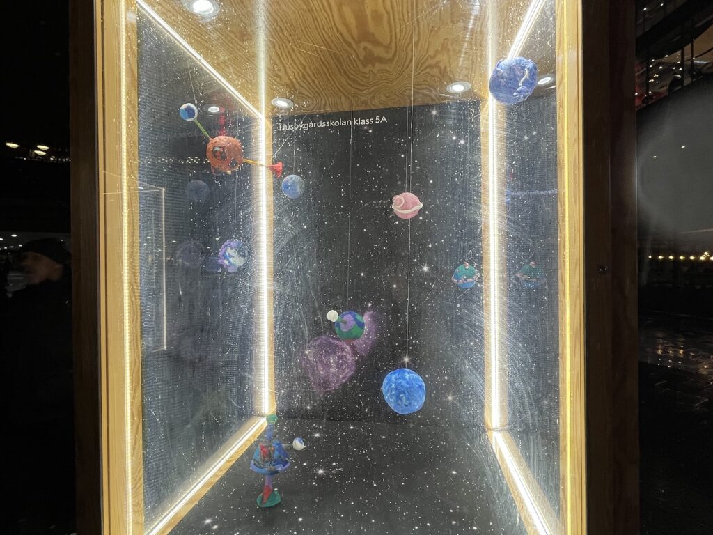 Ljusinstallationerna på Sergels torg, som elever i Husbygårdsskolan gjort modellerna till.