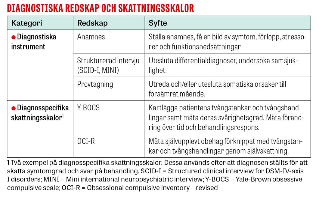 MINI och SCID-I innehåller screeningfrågor om tvångssyndrom, vilket är användbart då tvångssyndrom kan vara förknippat med skam och därför inte nödvändigtvis framkommer i en allmän anamnes. Ett typiskt kroniskt förlopp och en tidig debut stärker dia­gnosmisstanken. Den vanligaste åldern för dia­gnos är 10–20 år, men tillståndet kan debutera i alla åldrar [13]. Laboratorieblodprov rekommenderas för att utesluta tillstånd som kan bidra till försämrat psykiskt mående. Tvångssyndrom kan leda till isolering i hemmet eller enformig kost, varför nutritionsproblem och vitaminbrist bör uteslutas.