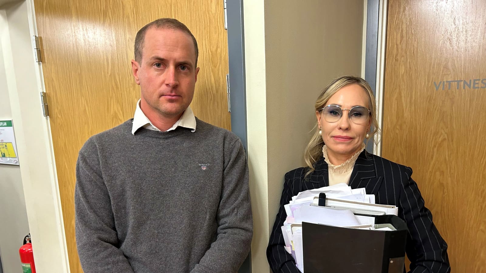 Robert Salomonsson med försvarare Lisa Länta under björnjaktsrättegång i Lycksele tingsrätt 2024.