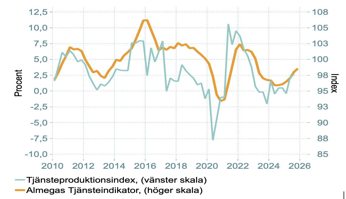 Almegas tjänsteindikator täcker in cirka 90 procent av den privata tjänste­sektorns föräd­lings­värde och drygt 80 procent av dess sysselsättning.28 Indikatorn bygger på en skattning av sambandet mellan tjänsteföretagens svar i Konjunkturinstitutets konjunkturbarometer och utfallet för produk­tionstillväxten i den privata tjänste­sektorn enligt SCB:s tjänste­produk­tions­­index. Skattningen utgår från sambandet mellan bland annat företagens förväntningar om det kommande kvartalets efterfråge- och produktions­utveckling och den faktiska utvecklingen av tjänste­produktionen per kvartal enligt Statistiska Centralbyråns (SCB) tjänsteproduktions­index.