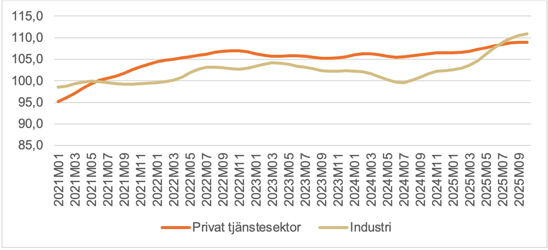 Diagram 2: Produktion inom tjänstesektor och industri, januari 2021 till oktober 2025
