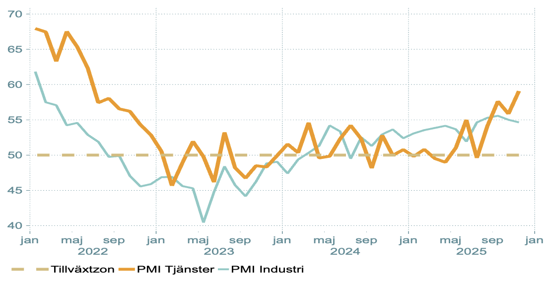 Diagram 3: Inköpschefsindex för privata tjänster och industri, jan 2022 till nov 2025
