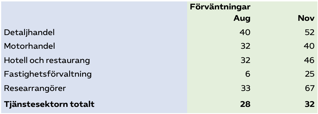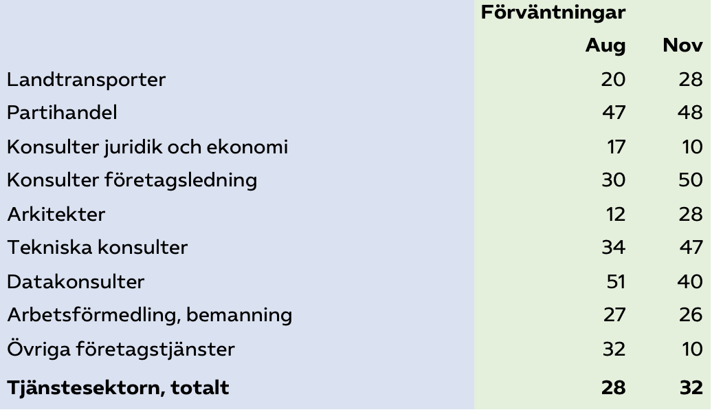 Tabell 1: Efterfrågan i tjänstebranscher som främst säljer till företag. Förväntningar tre månader framåt, augusti och november 2025