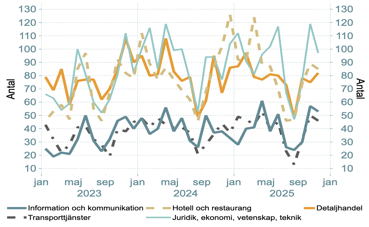 Diagram 8: Konkurser i tjänstebranscher, januari 2023 till november 2025