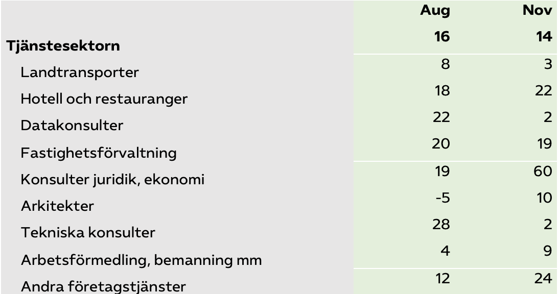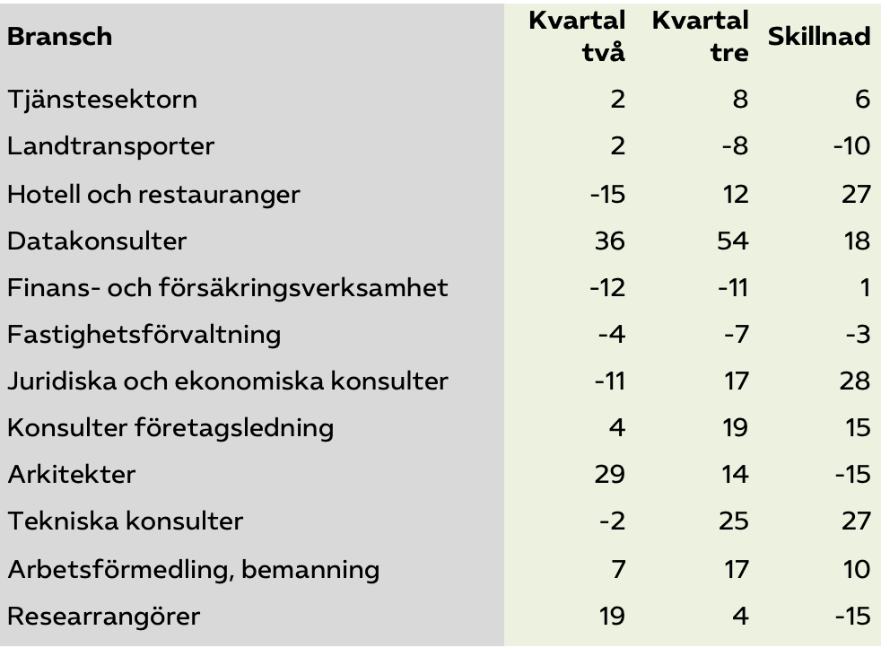 Anställningsplanerna skiljer sig kraftigt mellan tjänstesektorns branscher. Mest positiva är datakonsulter följt av tekniska konsulter som både blivit mer positiva det senaste kvartalet. Anställningsplanerna bland arkitekter har dock blivit mindre positiva trots att efterfrågan på arkitekttjänster är på väg upp. Inom arbets­för­medling och bemanning har anställningsplanerna blivit mer positiva det senaste kvartalet.