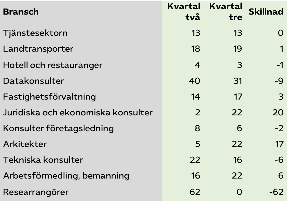 Sysselsättningen har ökat i de flesta tjänstebranscher men inte i alla. Flest nya jobb har skapats bland konsulttjänster inom juridik, ekonomi, vetenskap och teknik. På ett år har antalet anställda ökat med 7 400 personer, eller drygt två procent. Den mest expansiva branschen är tekniska konsulter och arkitekter där 4 900 nya jobb har skapats det senaste året.