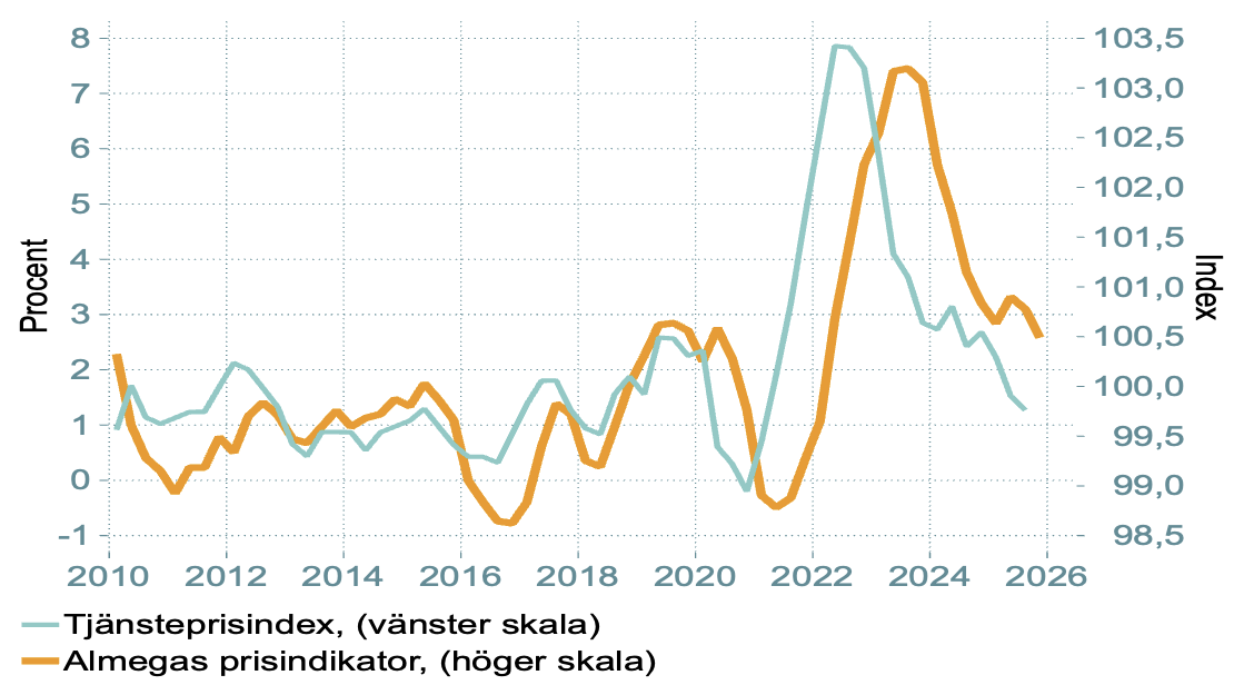 De sammanvägda prisökningarna på både varor och tjänster är lägre. Räknar man bort effekten av sänkta räntor (KPIF) var inflations­takten 2,3 procent i november. Den höga prisökningstakten beror främst på höjda priser på livsmedel det senaste året. Räntesänkningarna det senaste året innebär dock att inflationen enligt KPI i november stannade på 0,3 procent i årstakt.26