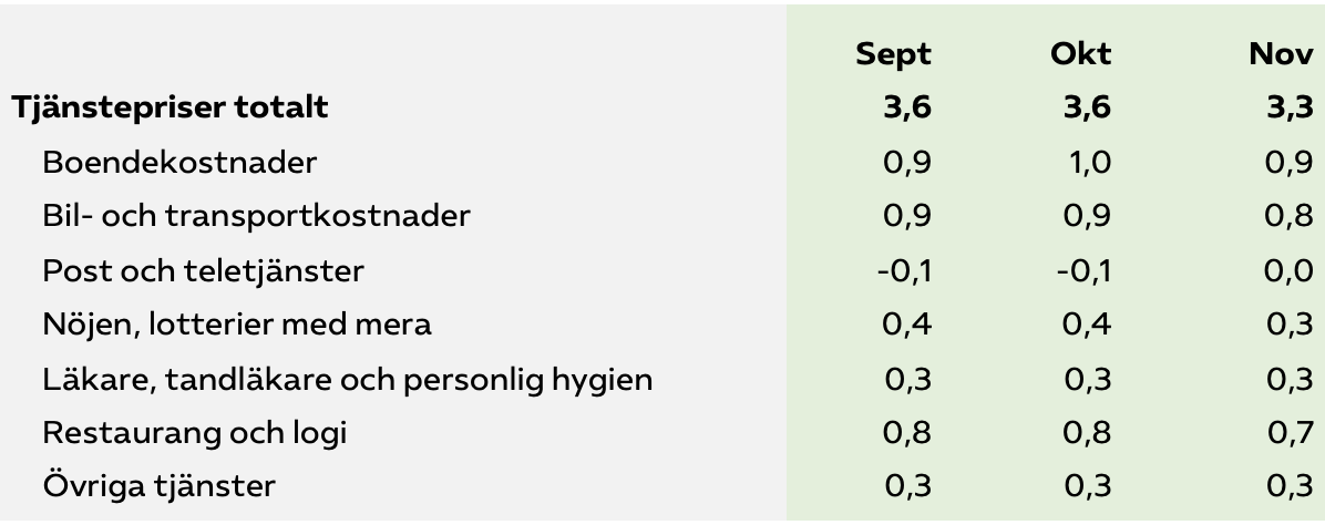 Priserna på de tjänster som säljs direkt till konsumenter i Sverige ökar betydligt snabbare än priserna på alla tjänster. I november steg konsumentpriserna på tjänster med 3,3 procent, vilket var 0,3 procentenheter långsammare än i oktober. Ökande boende­kostnader är den viktigaste förklaringen till höjda tjänstepriser men en allt större del beror på stigande kostnader för bil och andra transporter.